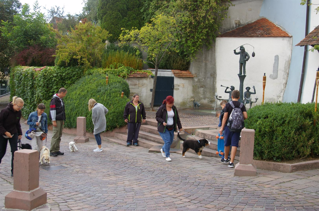 Heute hat die Welpengruppe einen Ausflug in die Engener Innenstadt gemacht. Es ging sozusagen über Stock und Stein. Die Welpen durften Begegnungsverkehr mit Autos und Passanten kennen lernen. Die Brunnen und das Wasser war sehr interessant. Ganz spannend wurde es dann beim Aufzugfahren, ist dieser doch aus Glas. so dass die Höhe, in der sich die Welpen befanden, doch sehr zur Geltung kam. Auch im Stadtgarten wurden die jungen Hunde sehr viel neuen Dingen konfrontiert. Aber sie haben es super gemeistert.