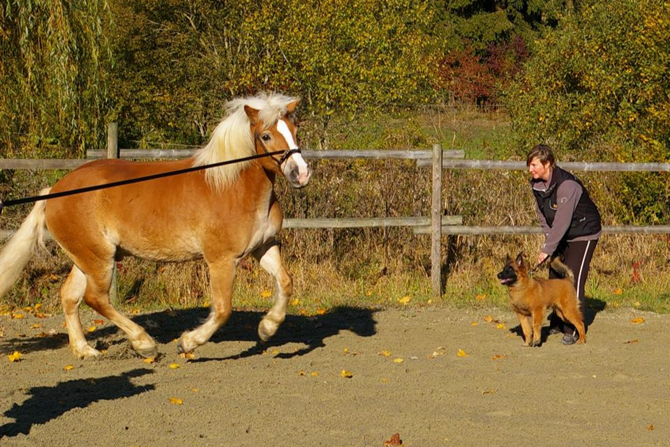 Dank Nina, die uns diesen Besuch ermöglicht hat, hatten wir Gelegenheit, mit den Welpen, in direkter Tuchfühlung mit den Pferden, zu arbeiten. Hierbei ging es darum, dass die Welpen sich ruhig verhalten, auch wenn die Pferde ganz nah an ihnen vorbei gingen. Die Pferde wurden im Trab und im Galopp longiert, während die Welpen bei ihren Besitzern verharren mussten.