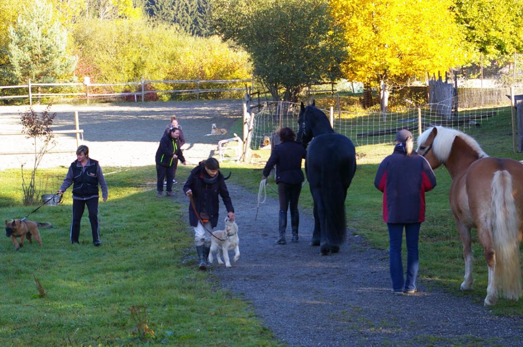 Am heutigen herrlichen Herbstmorgen machten wir uns auf, einen Pferdehof zu besuchen. Für die Welpen natürlich eine ganz andere Welt, denn so viele Pferde auf einmal hatten sie doch noch nie gesehen. Und vor allem durften sie ihnen noch nie so nahe kommen.
