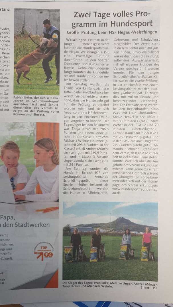 Gerichtet wurden ein Begleithund, vier IBGH 1, eine IBGH 2, zwei IGP 1, eine IGP 2 sowie zwei IFH V.