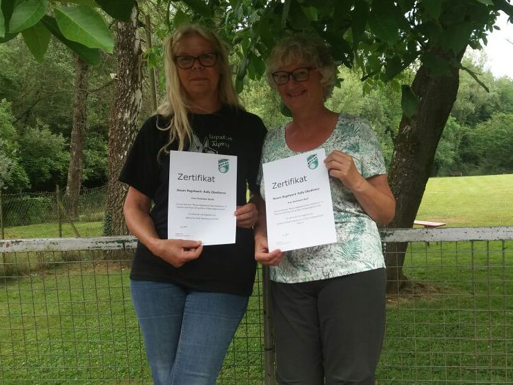 Christiane Gierth als Übungsleiterin der Sportart Rally Obedience und Rosemarie Bach haben sich weiter bilden lassen. Sie absolvierten ein eintägiges Seminar, das von Leistungsrichterin Angelika Just (Obfrau Rally Obedience im DVG) abgehalten wurde. Unterrichtet wurden in der Hauptsache die praktischen Übungen mit seinem eigenen Hund, aber auch der theoretische Teil kam nicht zu kurz, da besonders das neue Regelwerk in dieser Trendsportart nahe gebracht wurde. Die Teilnehmer erhielten für die erfolgreiche Schulung ein Zertifikat.