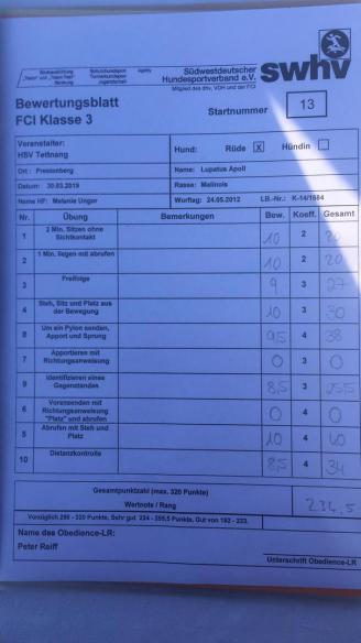 Am heutigen Samstag haben Silke Wachter mit Balou und Carmen Kamenzin mit Lupatus Aaron an der Obedienceprüfung beim VdH Gottmadingen teilgenommen. Gestartet sind beide in der Klasse 2 und haben auch da tolle Ergebnisse erzielt.
