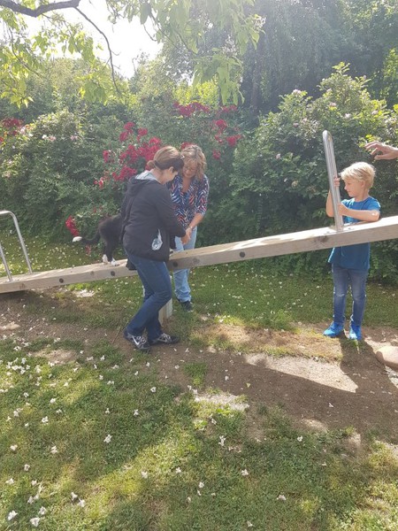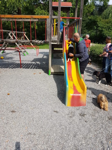 Der Regen war echt übel. Die Kinder waren trotzdem mit Eifer dabei. So wurden noch zwei kleine Pavillons aufgestellt, damit man etwas geschützt war an den Stationen. An einer Station war ein Slalom zu laufen und das Kind hatte einen Becher Wasser mit einem Ball in der Hand. Natürlich gab es Hilfe von dem Hundebesitzer. Die nächste Station war der Agility Parcours. Man sah den Kids an, wie toll sie es fanden mit einem Hund zu arbeiten. Die 3. Station war dann, dass richtige Spielen mit dem Hund. Vermutlich sind diese Hunde abends im Hundebett gelegen und haben nur noch geschlafen. Die 4. Station war ein kleiner Rally- Obedience Parcours. Mit viel Geschick haben die Kinder diese Aufgabe gemeistert.