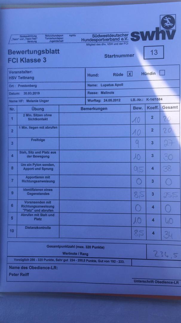 Wir freuen uns riesig für Melanie Unger mit ihrem Bömbi. Sie hat sich gestern an der Auswärtsprüfung beim HSV Tettnang für die Verbandsmeisterschaft Obedience am 15.06.2019 qualifizieren können.