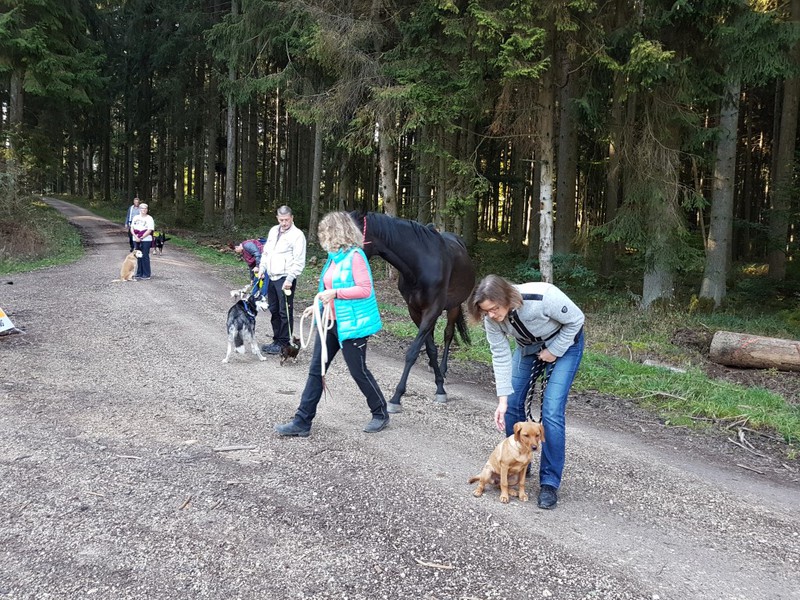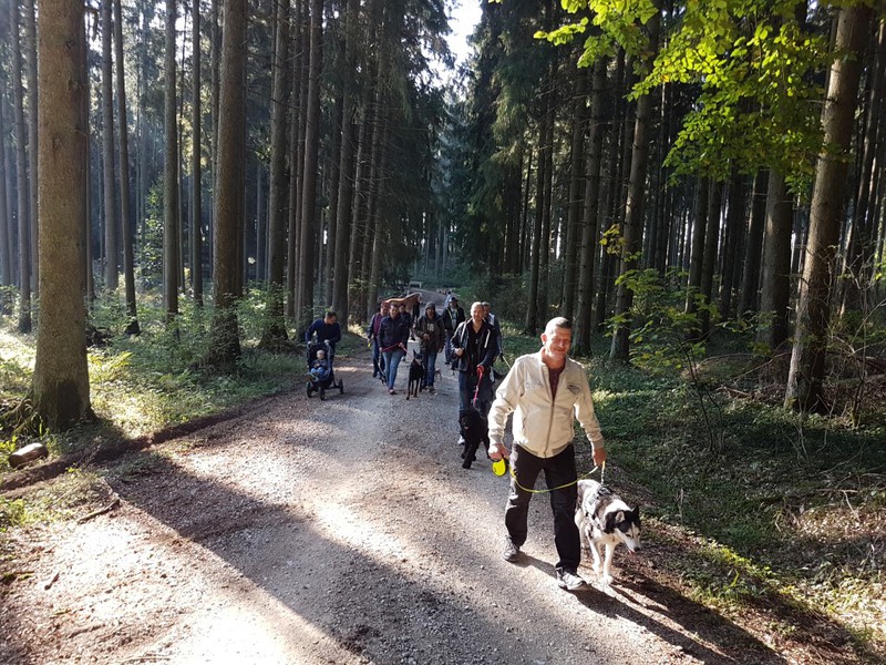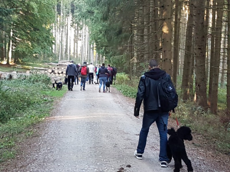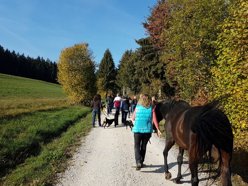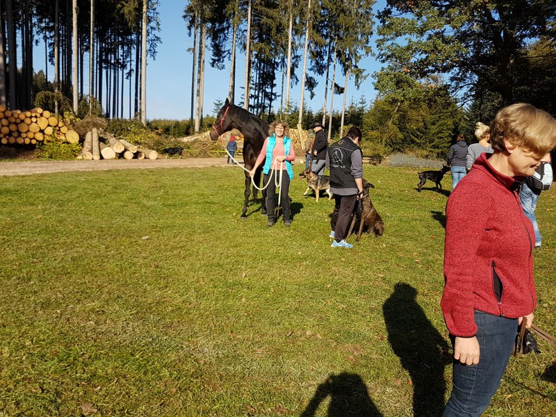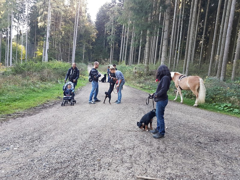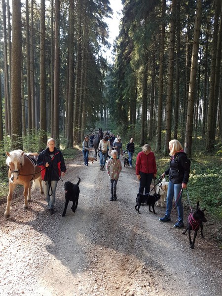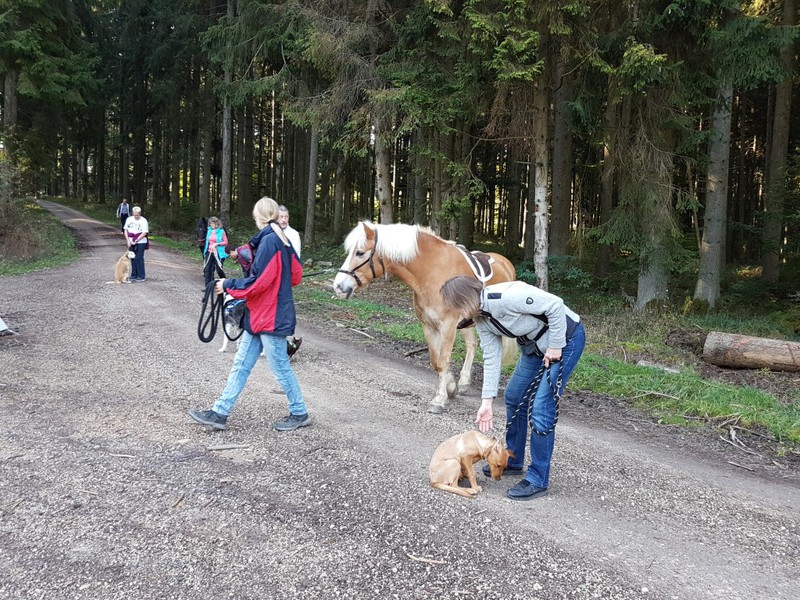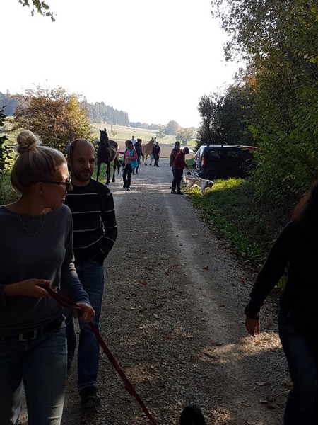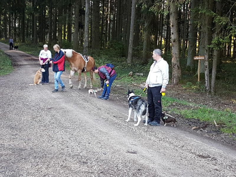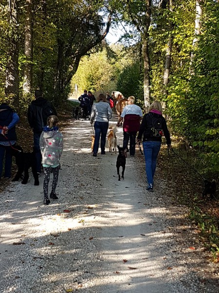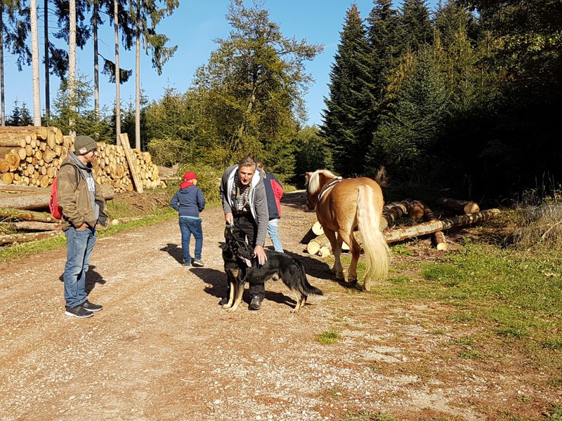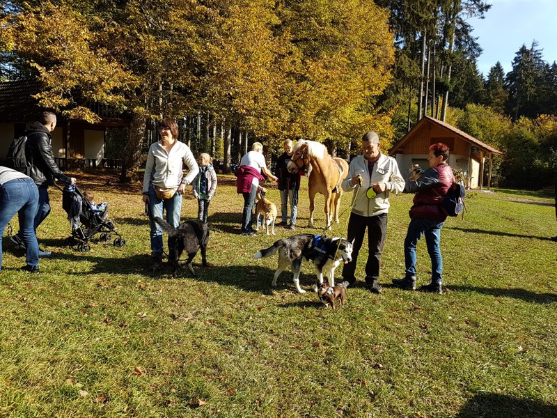 Am heutigen Sonntag unternahm der HSF eine kleine Hund/Pferdwanderung. 17 Hunde mit Kind und Kegel, sowie drei Pferde waren mit von der Partie. Bei unglaublich schönem Herbstwetter konnten wir in Tengen, bei einem Waldspaziergang, genau das üben, was sonst nicht so ohne weiteres möglich ist, nämlich Begegnungsverkehr mit Pferden.