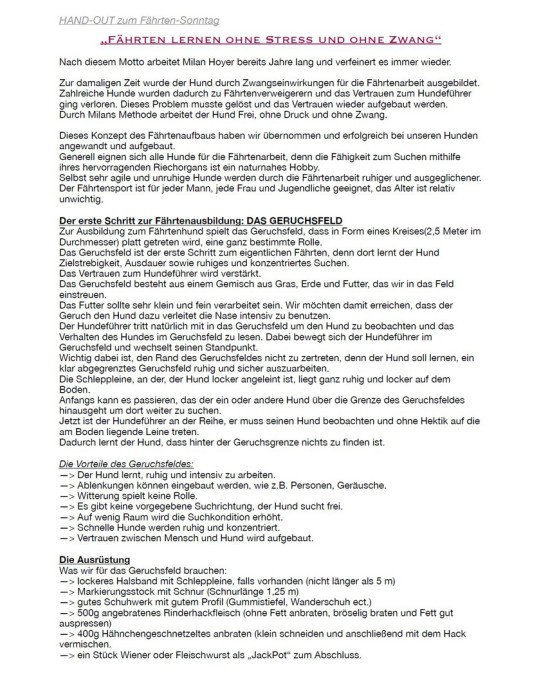 Wir möchten Euch gern die Fährtenarbeit mit dem Hund näher bringen. Wir laden deshalb ein, an einem Schnuppersonntag mit uns ins Gelände zu fahren und das mit unseren Hunden zu trainieren, was ihnen naturgegeben am meisten liegt, nämlich die Nasenarbeit.