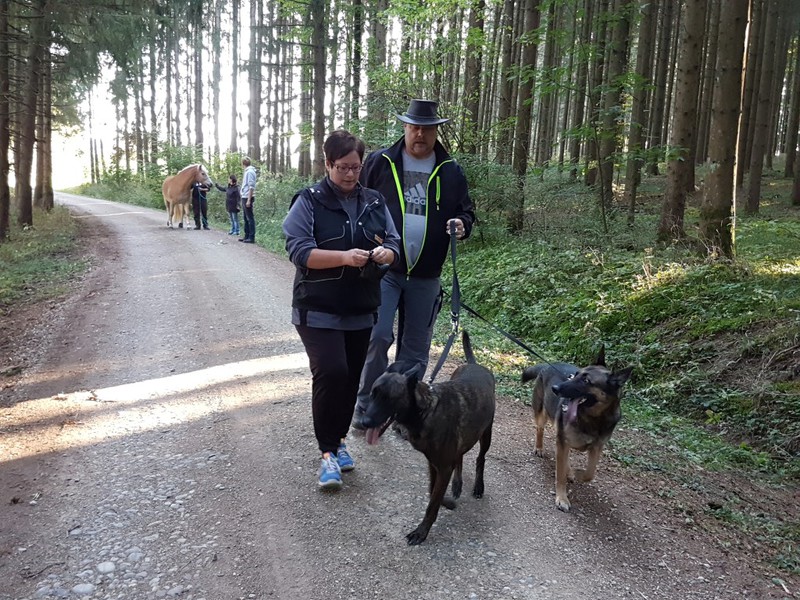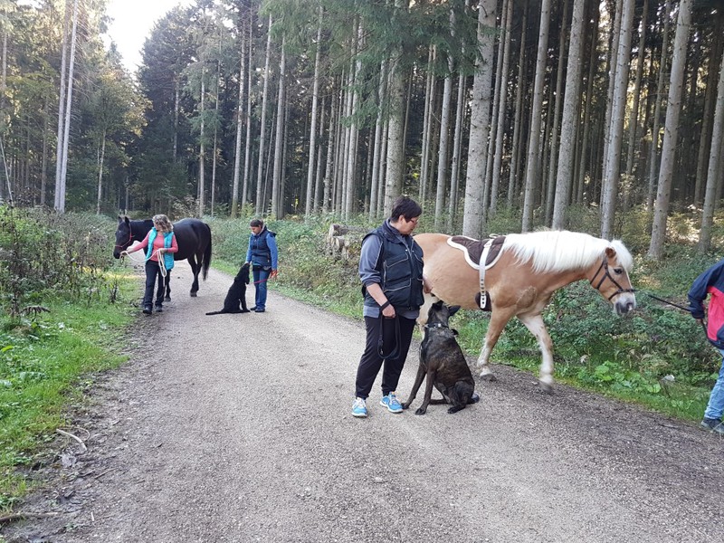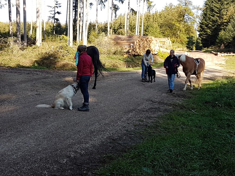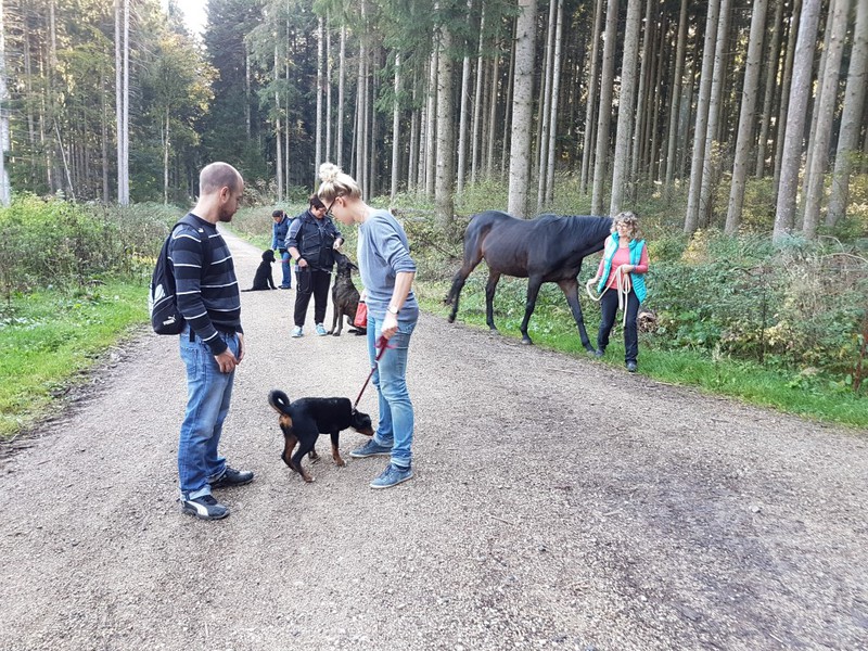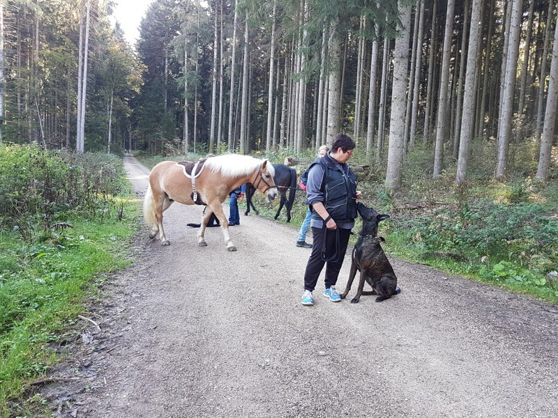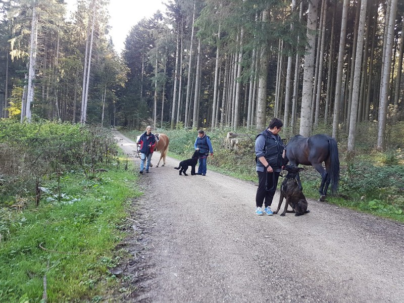 Und auch heute war es wieder über die Maßen erstaunlich, wie relaxed sowohl die Welpen, als auch die erwachsenen Hunde mit dieser Situation um gegangen sind. Gerade für die Welpen, die in dieser Richtung noch keine negativen Erlebnisse haben, ist es eine tolle Erfahrung, dass auch so große Tiere keine Bedrohung darstellen, und man ganz entspannt einen gemeinsamen Weg beschreiten kann.