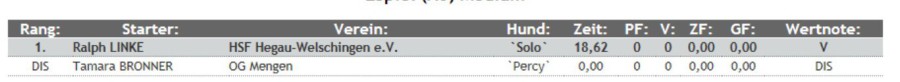 Hundeführer | Hund | Rasse | Prüfung | Punkte | Zeit | Platz |