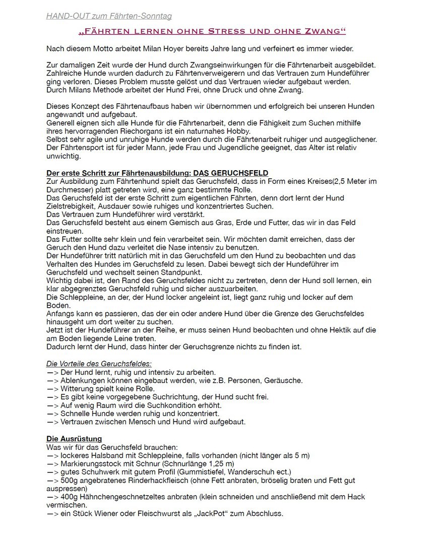 Die Methode des Aufbaus in der Fährte, die über unseren Verein angeboten wird, basiert auf eine zwang- und stressfreie Sucharbeit des Hundes in einer hohen Motivationshaltung. Dadurch erreicht man eine hochkonzentrierte, aber ruhige und ausgeglichene Ausarbeitung der Fährte.