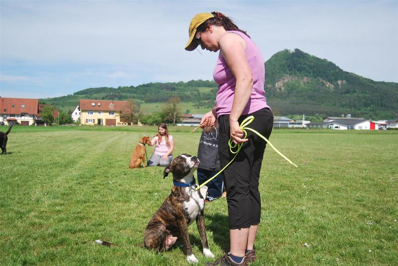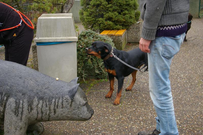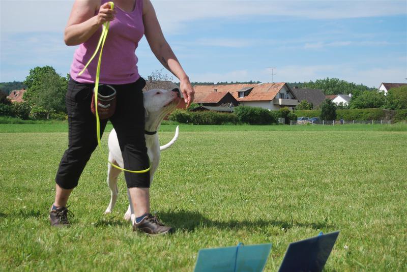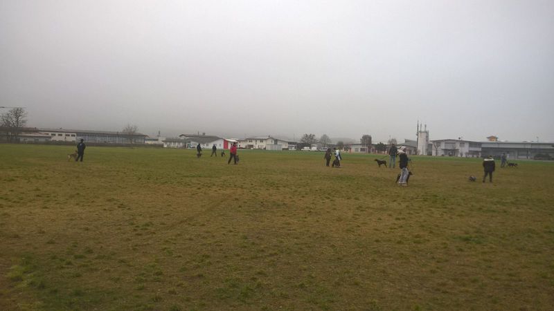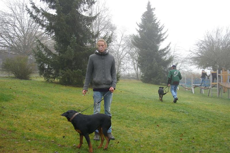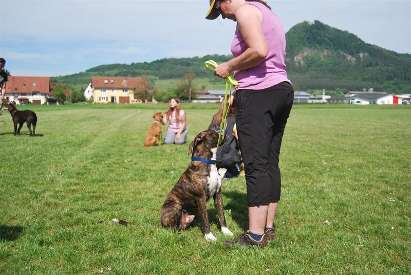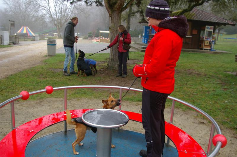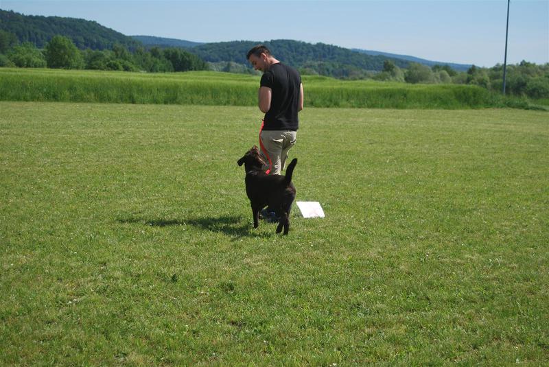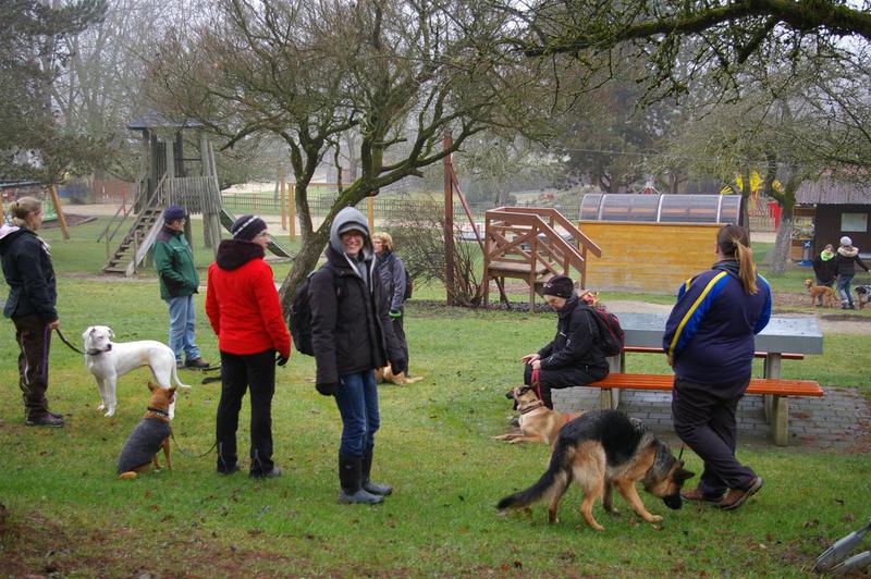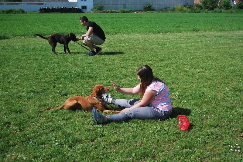 Es liegen nunmehr vier Trainingseinheiten hinter uns. Das Hauptaugenmerk lag bislang bei der Leinenführigkeit (auch unter Ablenkung von Futter bzw. Spielzeug), Begegnungsverkehr mit anderen Hunden bzw. Personen und Abrufübungen unter Ablenkung. Es wurden kleinere Spaziergänge unternommen, an denen das Gelernte umgesetzt werden soll. Am Schluss der heutigen Übungsstunde hatten wir zum ersten Mal einen kompletten Ortswechsel, um den Hunden auch ein anderes Umgebungsbild zu schaffen.