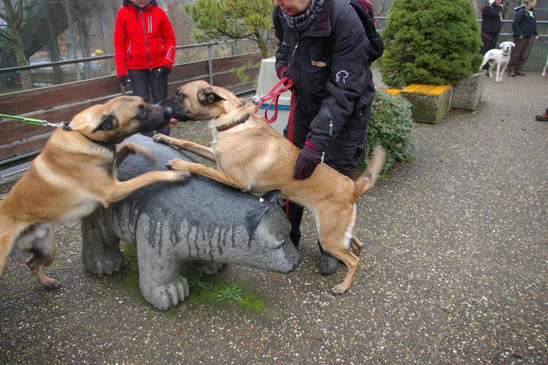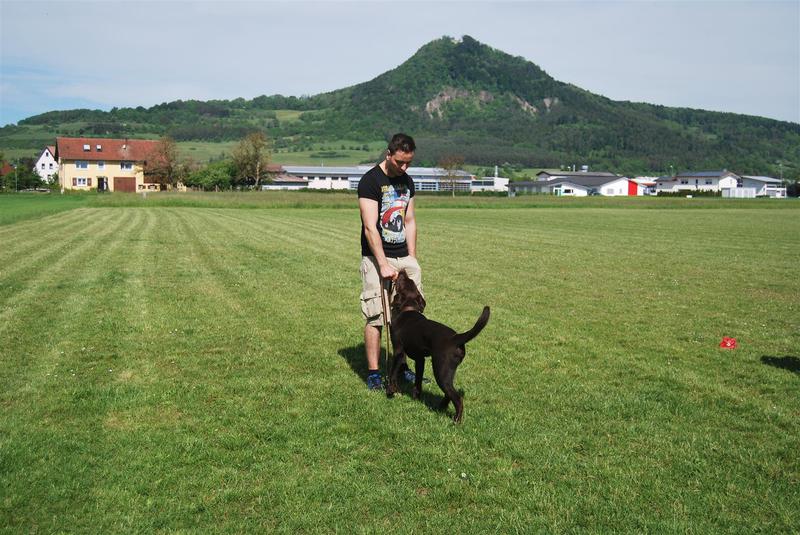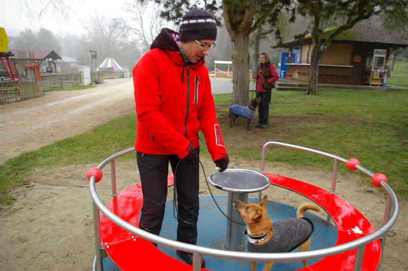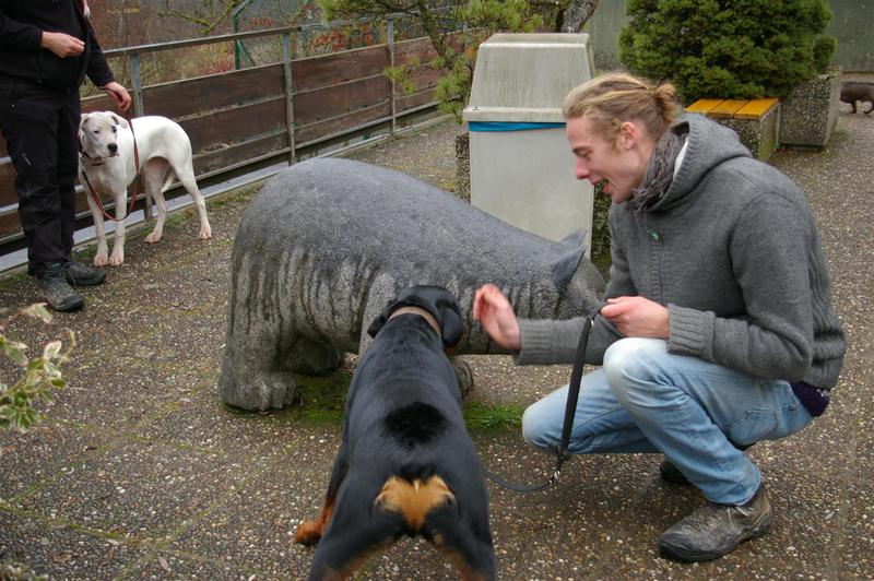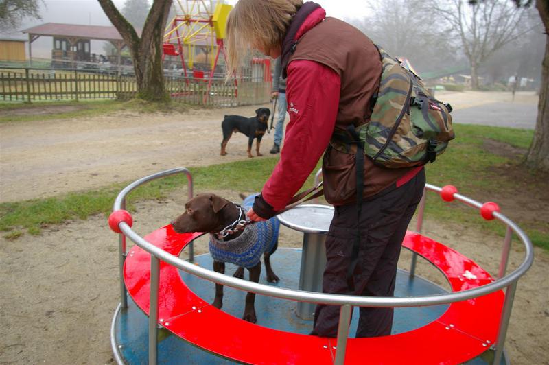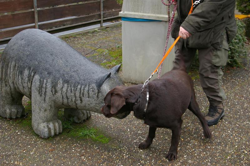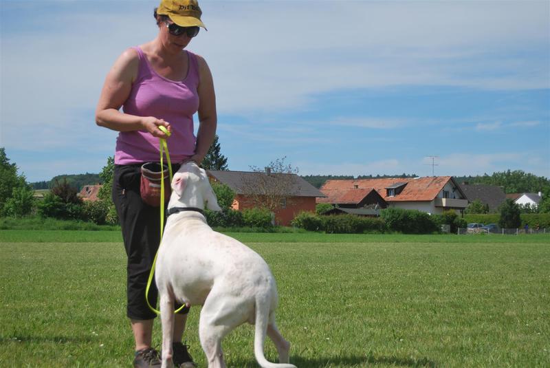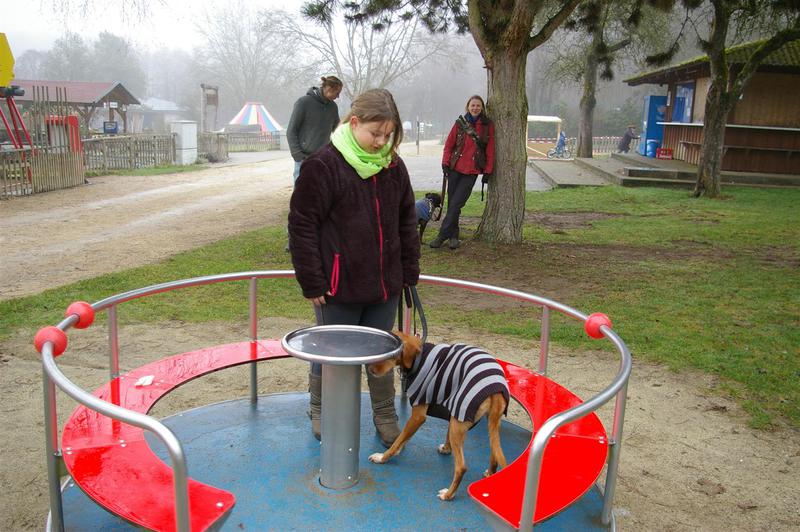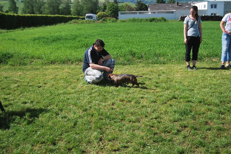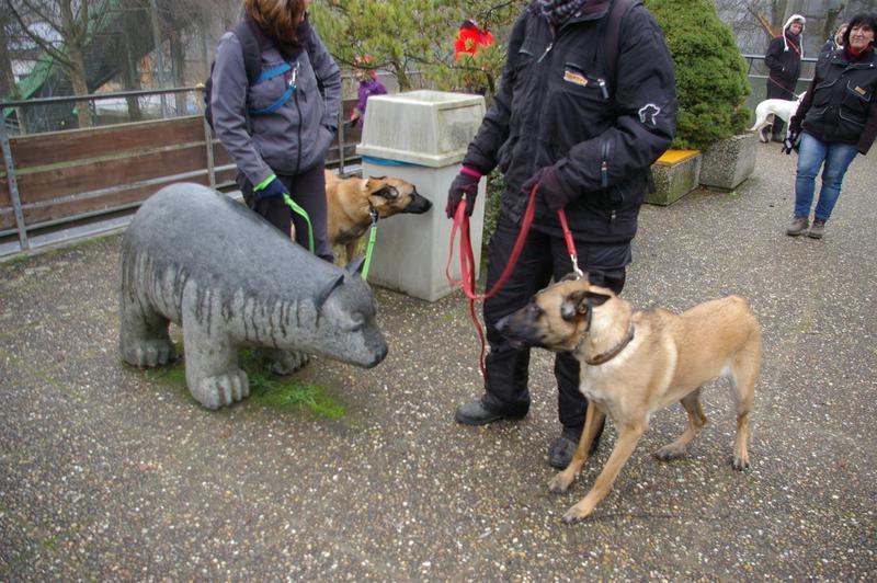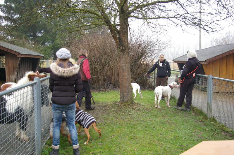 Es liegen nunmehr vier Trainingseinheiten hinter uns. Das Hauptaugenmerk lag bislang bei der Leinenführigkeit (auch unter Ablenkung von Futter bzw. Spielzeug), Begegnungsverkehr mit anderen Hunden bzw. Personen und Abrufübungen unter Ablenkung. Es wurden kleinere Spaziergänge unternommen, an denen das Gelernte umgesetzt werden soll. Am Schluss der heutigen Übungsstunde hatten wir zum ersten Mal einen kompletten Ortswechsel, um den Hunden auch ein anderes Umgebungsbild zu schaffen.